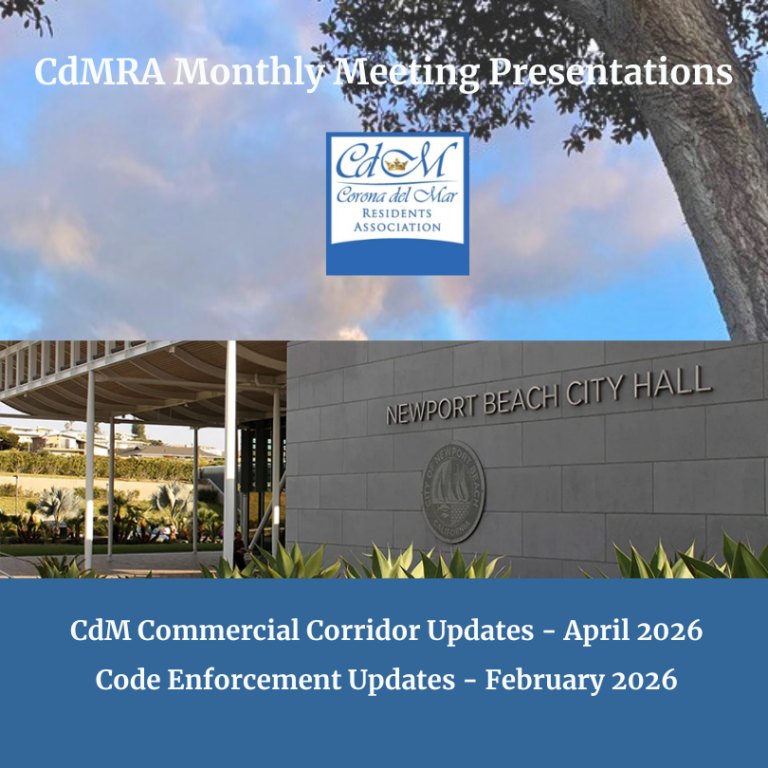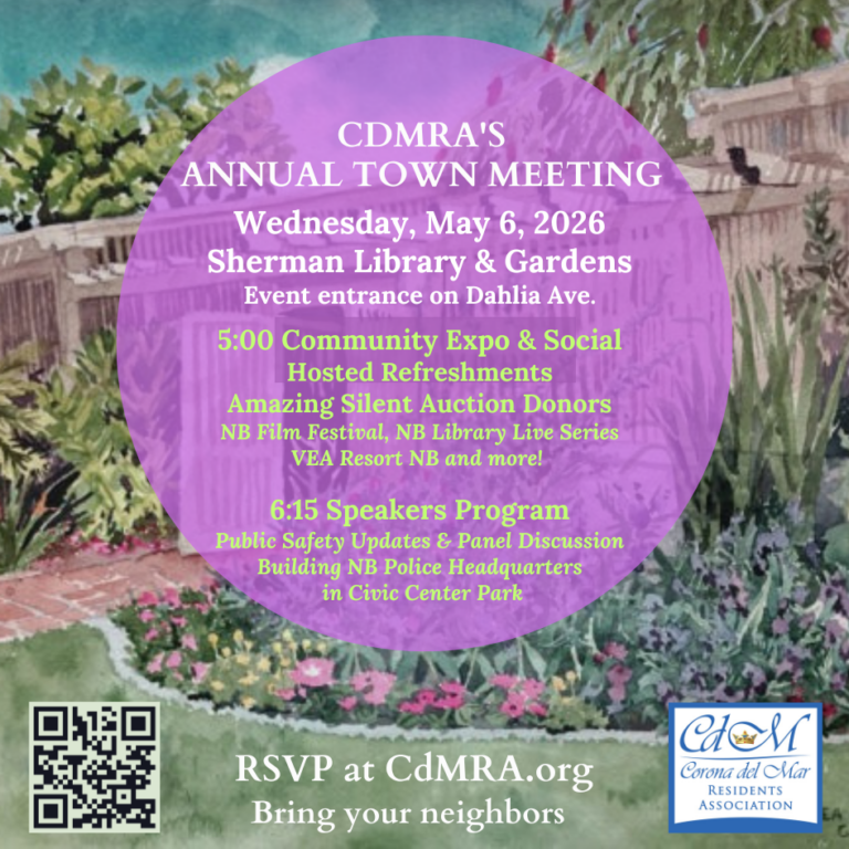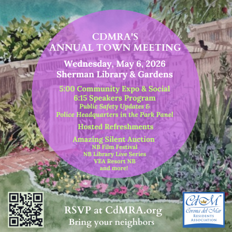 RSVP today The Corona del Mar Residents Association’s (CdMRA) 2026 Annual Town Meeting will be held on Wednesday, May 6, at the lovely Sherman Gardens in Corona del Mar. Our annual signature event includes two distinct segments: 5:00 p.m.: Community Social and Civic Expo which includes interactive displays, meet-and-greet stations